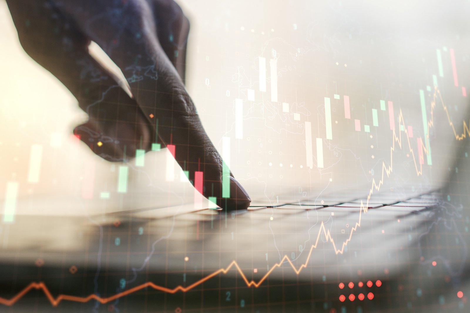 Close up of hand using laptop with creative candlestick forex chart or graph on blurry wide city background. Financial trade market and stock concept. Double exposure.