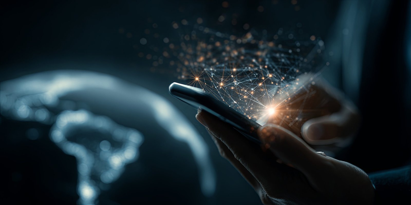 3D render of a smartphone with central AI brain, metallic robotic parts surrounding it